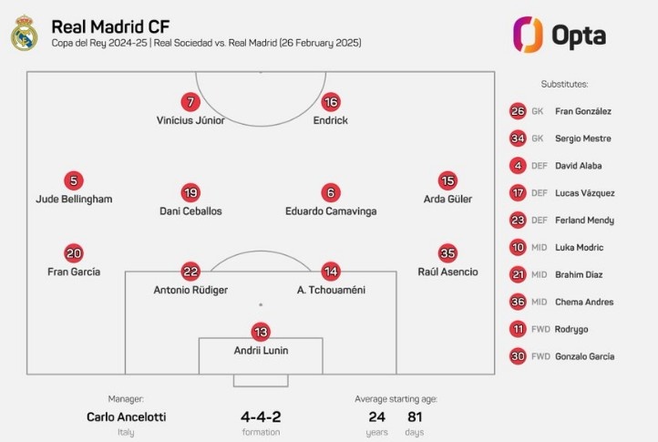 皇馬變陣,居勒爾、恩德里克、維尼修斯首次搭檔先發(fā)出戰(zhàn) 2月27日訊 國王杯半決賽首回合皇馬對陣皇家社會的比賽即將開始,雙方首發(fā)陣容公布。在皇馬首發(fā)陣容中同時排出了居勒爾、恩德里克以及維尼修斯,這還是三人在各項賽事中首次共同為皇馬先發(fā)出戰(zhàn)。 2025/02/27
