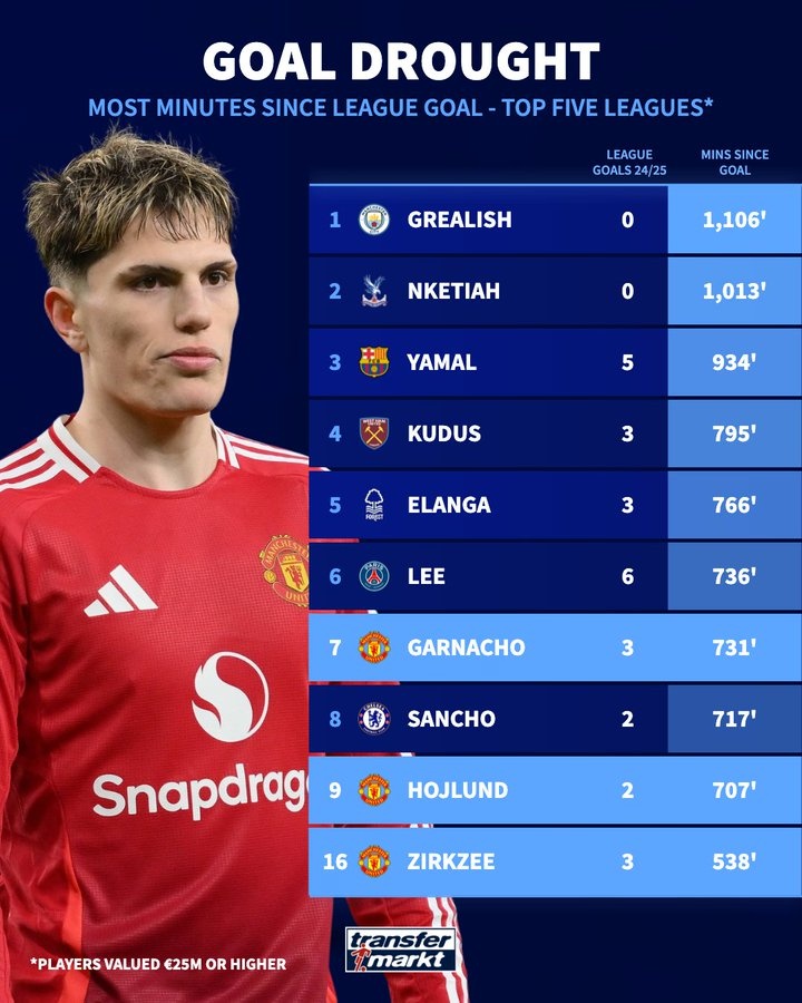 五大聯(lián)賽進(jìn)球荒時(shí)間排名:格拉利什1106分鐘居首 亞馬爾934分鐘 2月26日訊 德國(guó)轉(zhuǎn)會(huì)市場(chǎng)統(tǒng)計(jì)了目前五大聯(lián)賽的進(jìn)球荒時(shí)間排名,曼聯(lián)有2名球員進(jìn)入前十。五大聯(lián)賽進(jìn)球荒時(shí)間排名(身價(jià)2500萬(wàn)歐元或以上):1、格拉利什(曼城),本賽季進(jìn)0球,1106分鐘2、恩凱提亞( 2025/02/26