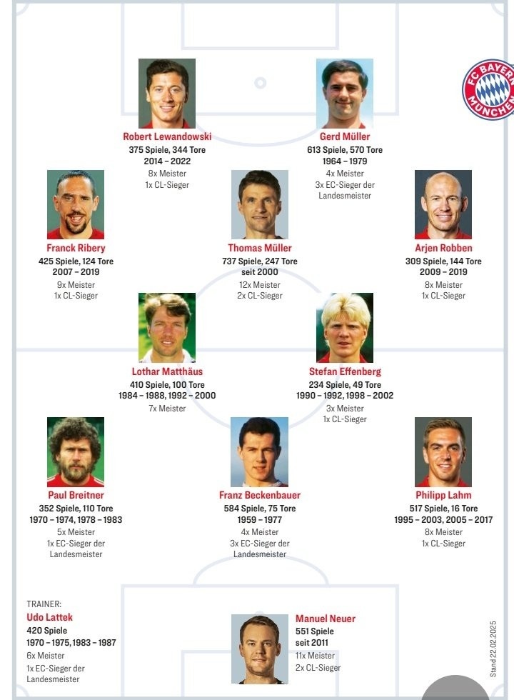 踢球者評拜仁歷史最佳陣:萊萬+2穆勒領(lǐng)銜,羅貝里、馬特烏斯在列 2月24日訊 拜仁迎來俱樂部成立125周年紀念,《踢球者》也評出了一套拜仁歷史最佳陣容。主教練:烏多-拉泰克(1970-1975、1983-1987),420場,6德甲、1歐冠陣型:3232左中鋒:萊 2025/02/24