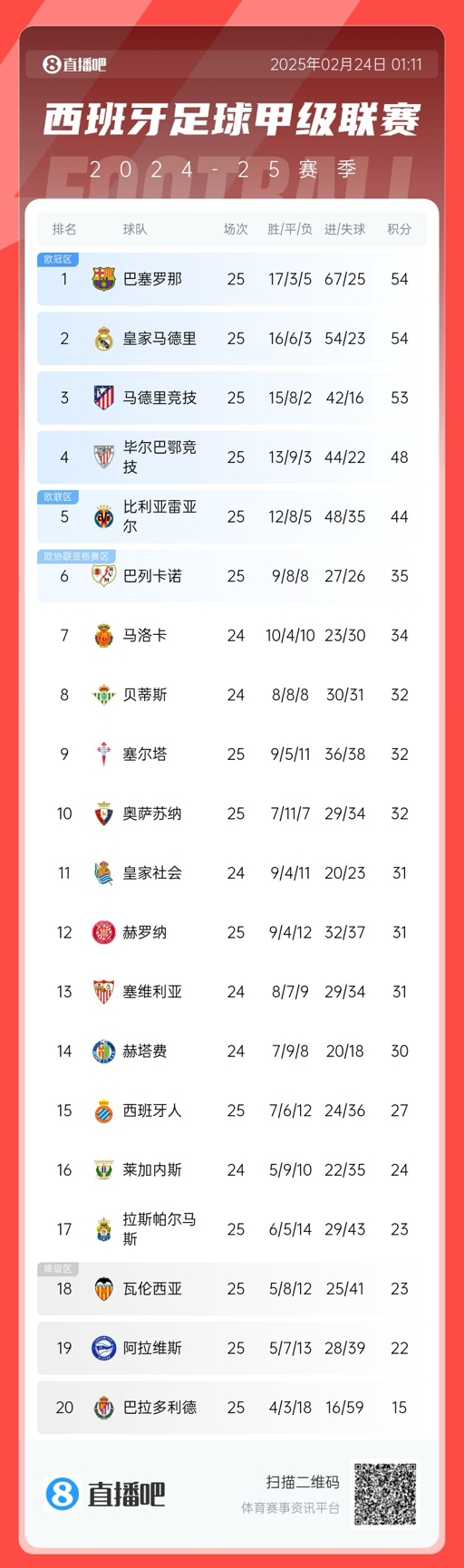 爭冠白熱化!西甲積分榜:巴薩、皇馬同分排1、2,馬競落后1分第3 2月24日訊 西甲第25輪,皇家馬德里主場2-0戰(zhàn)勝赫羅納。最新西甲積分榜形勢如圖: 2025/02/24