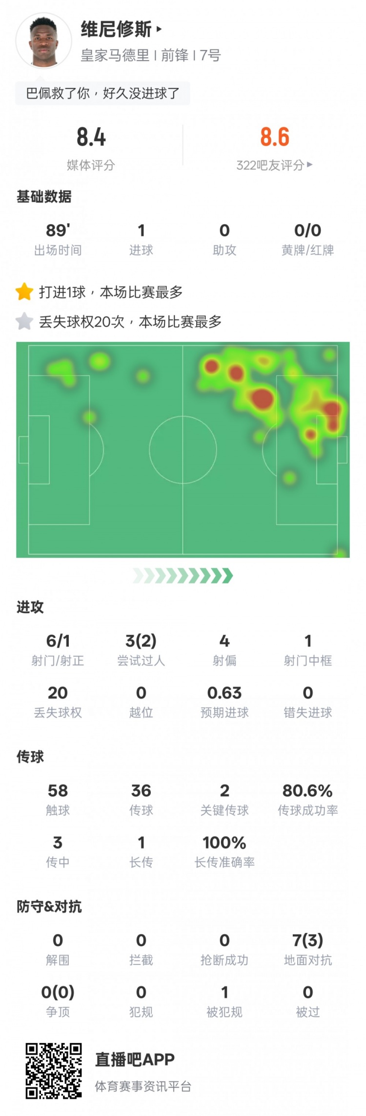 維尼修斯本場比賽數(shù)據(jù):1進(jìn)球&20次丟失球權(quán)全場最多,評分8.4 2月24日訊 西甲第25輪,皇馬2-0戰(zhàn)勝赫羅納。維尼修斯首發(fā)出戰(zhàn),貢獻(xiàn)1粒進(jìn)球,但也有全場最多的20次丟失球權(quán),評分8.4。維尼修斯本場比賽數(shù)據(jù)如下:進(jìn)球1助攻0射門6射正1過人3過人成功2射偏4射 2025/02/24