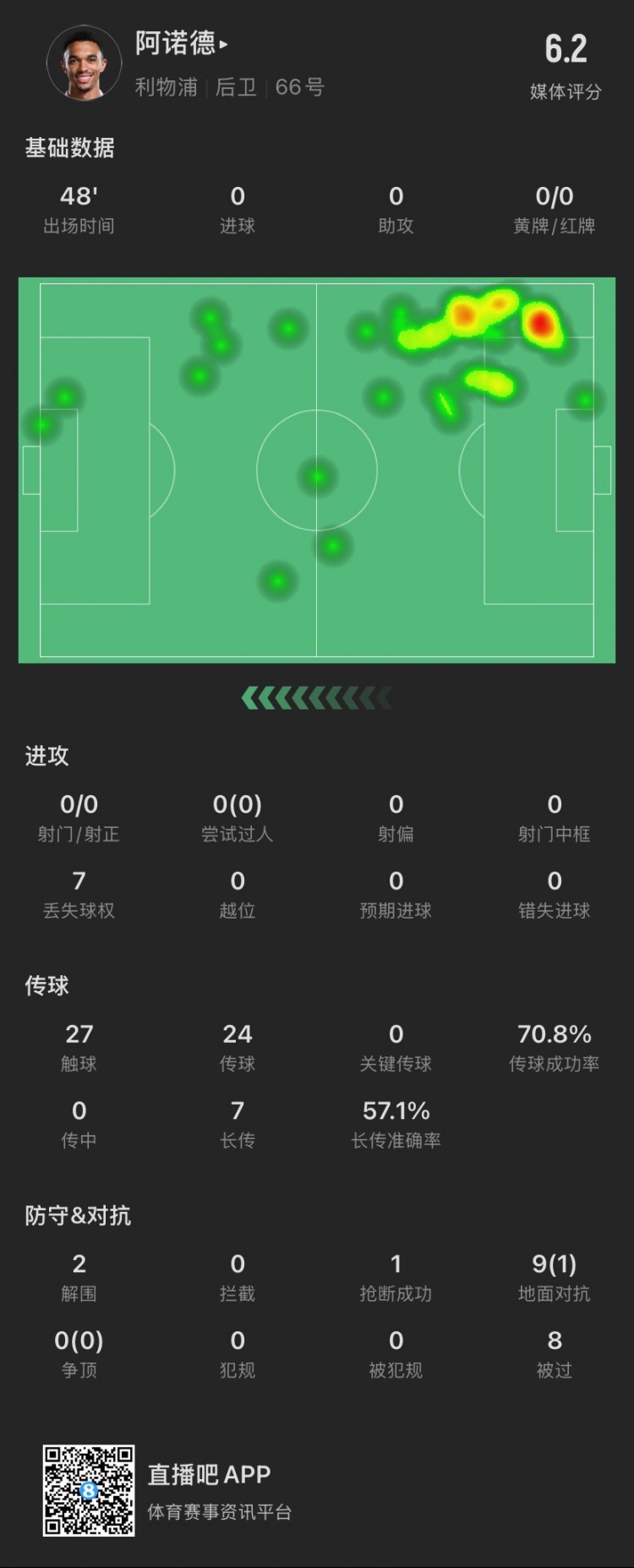 阿諾德半場:被過8次追平本賽季紀(jì)錄,9次對抗成功1次,貢獻(xiàn)2解圍 2月24日訊 英超第26輪,利物浦客戰(zhàn)曼城的比賽正在進(jìn)行。上半場,阿諾德8次被過、9次地面對抗只成功1次,獲評6.2分。阿諾德半場主要數(shù)據(jù)↓觸球:27丟失球權(quán):7傳球:24傳球成功率:70.8%長傳: 2025/02/24