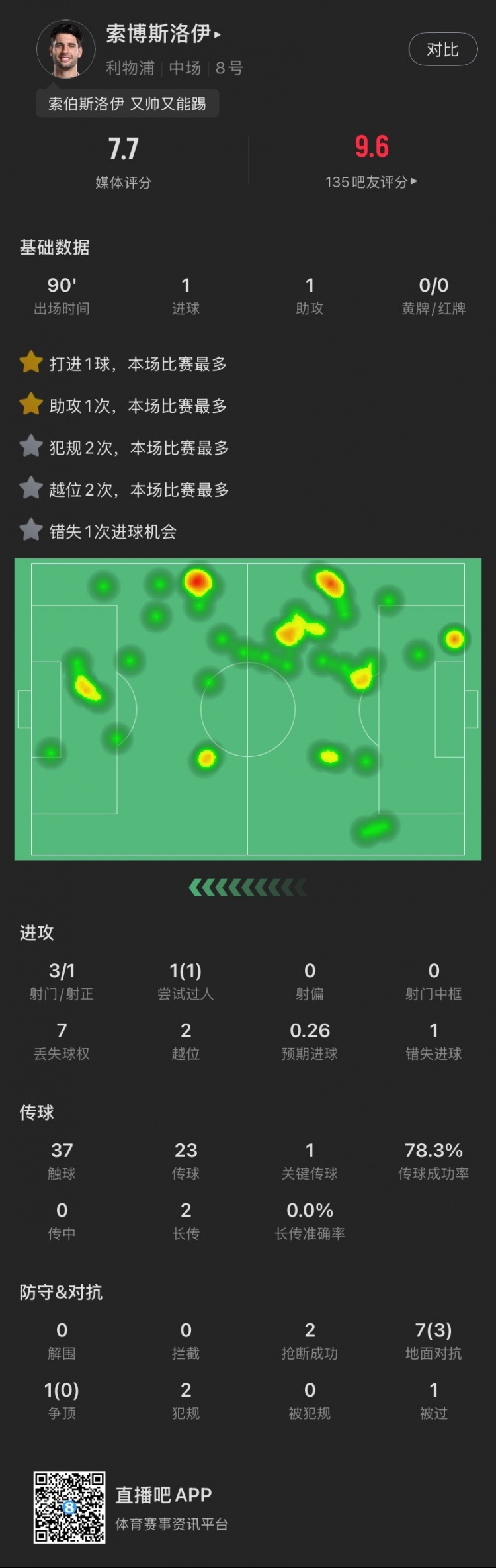 索博本場:傳射建功,越位2次全場最多,2搶斷,8次對抗成功3次 2月24日訊 在剛剛結(jié)束的英超本輪焦點(diǎn)戰(zhàn)中,利物浦2-0擊敗曼城。本場比賽,索博斯洛伊傳射建功,獲評7.7分。索博斯洛伊本場主要數(shù)據(jù)↓傳射建功↓射門:3(射正1)過人:嘗試1次,成功1次觸球:37丟失 2025/02/24