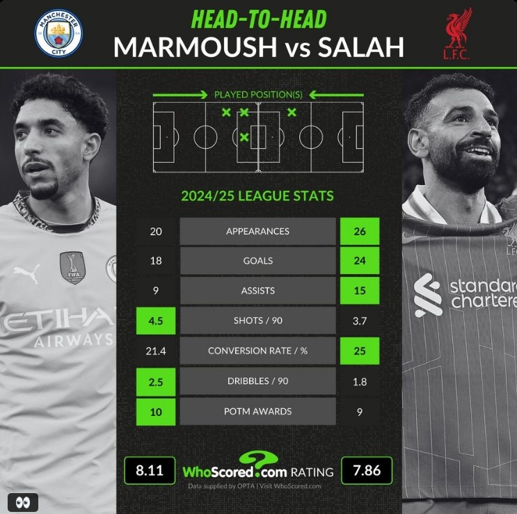 薩拉赫&馬爾穆什本賽季聯(lián)賽數(shù)據(jù)對比:前者進球、助攻均更勝一籌 2月23日訊 本輪英超將迎來曼城與利物浦的焦點對話,也是兩位埃及前鋒薩拉赫、馬爾穆什首次在英超交鋒,數(shù)據(jù)網(wǎng)站W(wǎng)hoscored對比了本賽季兩人在聯(lián)賽中的數(shù)據(jù),具體如下:馬爾穆什vs薩拉赫出場次數(shù):20 2025/02/23