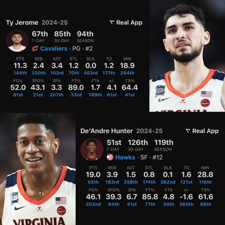 校友重聚!亨特和杰羅姆齊聚騎士 兩人在弗吉尼亞大學(xué)時NCAA奪冠 2月7日訊 據(jù)此前報道,老鷹將德安德烈-亨特交易至騎士,換回勒韋爾、尼昂、3個次輪(2027、2029、2031年)+2個次輪互換。至此,亨特和泰-杰羅姆兩人在騎士重聚,兩人是效力于弗吉尼亞大學(xué)時期的 2025/02/07