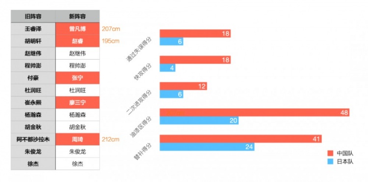 而與上一次亞預(yù)賽輸給日本隊相比,這次我們迎來了趙睿和周琦的回歸,并且多了2米07的高大鋒線曾凡博。正因為有這些能在對位中占據(jù)絕對體型優(yōu)勢的球員加入,我們才有了這次42分的大勝。