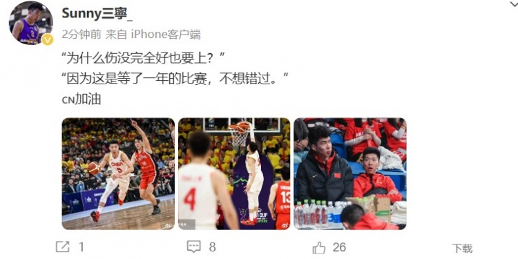 今日,廖三寧更博:“為什么傷沒(méi)完全好也要上?因?yàn)檫@是等了一年的比賽,不想錯(cuò)過(guò)。加油。”