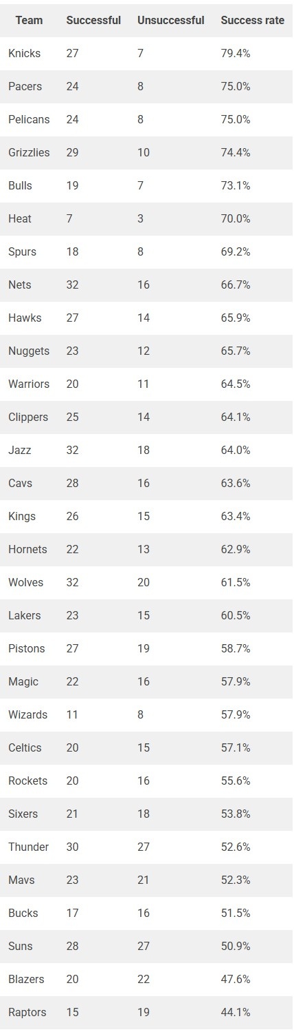 自2019年NBA引入挑戰(zhàn)規(guī)則以來,教練們在如何有效使用挑戰(zhàn)方面經(jīng)歷了一段摸索期。在規(guī)則實施的第一年,教練挑戰(zhàn)的整體成功率僅為44%。如今成功率已經(jīng)顯著上升,截至2月23日,NBA教練挑戰(zhàn)的成功率已達(dá)到61%。教練們在如何使用挑戰(zhàn)方面變得更加聰明,無論是在選擇挑戰(zhàn)的回合類型上,還是在快速查看回放以做出更好決策方面。盡管如此,聯(lián)盟中各位教練的挑戰(zhàn)成功率和使用頻率仍存在較大差異。不過,挑戰(zhàn)的決定遠(yuǎn)比球迷在電視機前看到的要復(fù)雜得多。