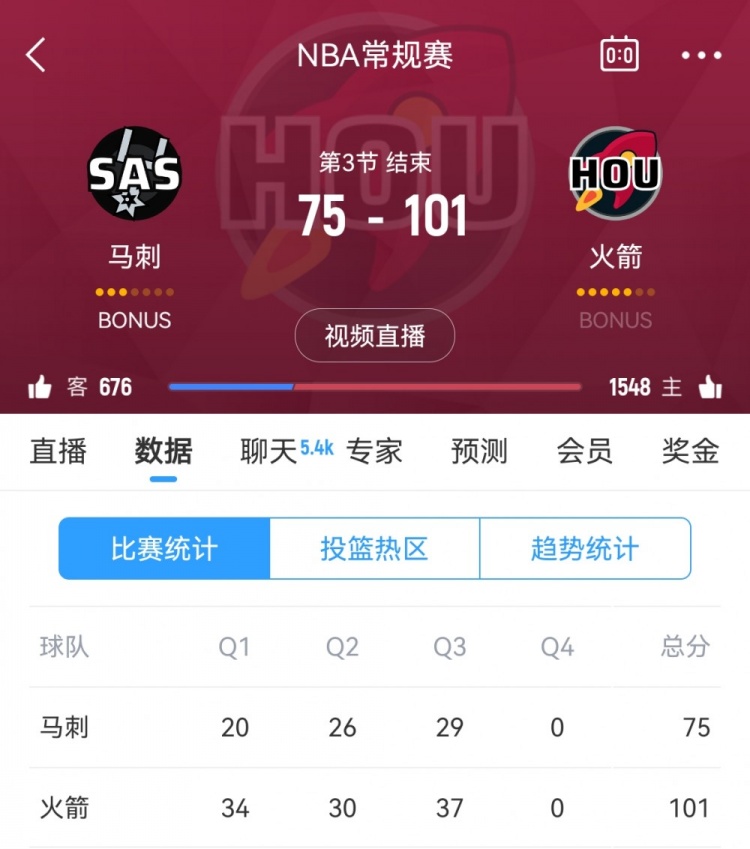 2月27日訊 NBA常規(guī)賽,火箭三節(jié)結束101-75領先馬刺。