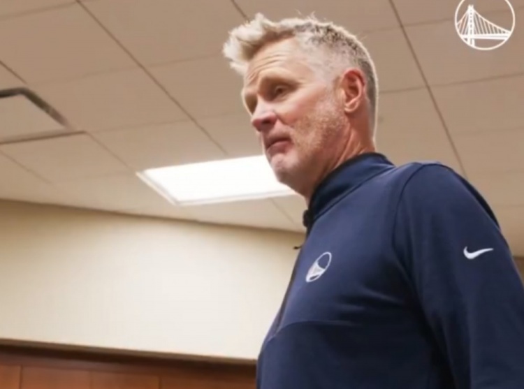 2月28日訊 勇士今日在客場17分大逆轉(zhuǎn)、121-115戰(zhàn)勝魔術(shù)。賽后科爾在更衣室內(nèi)表揚球員。