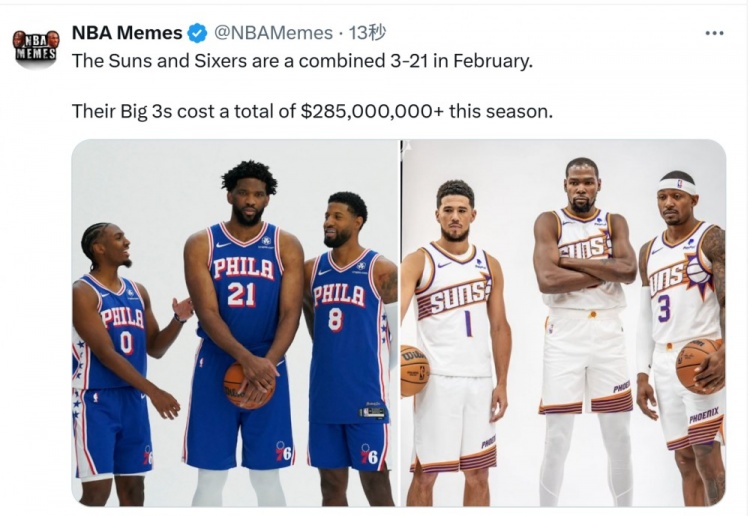 美媒NBA Memes:“太陽和76人二月份共計(jì)3勝21負(fù),而他們的三巨頭本賽季工資共計(jì)超過2.85億美元。”