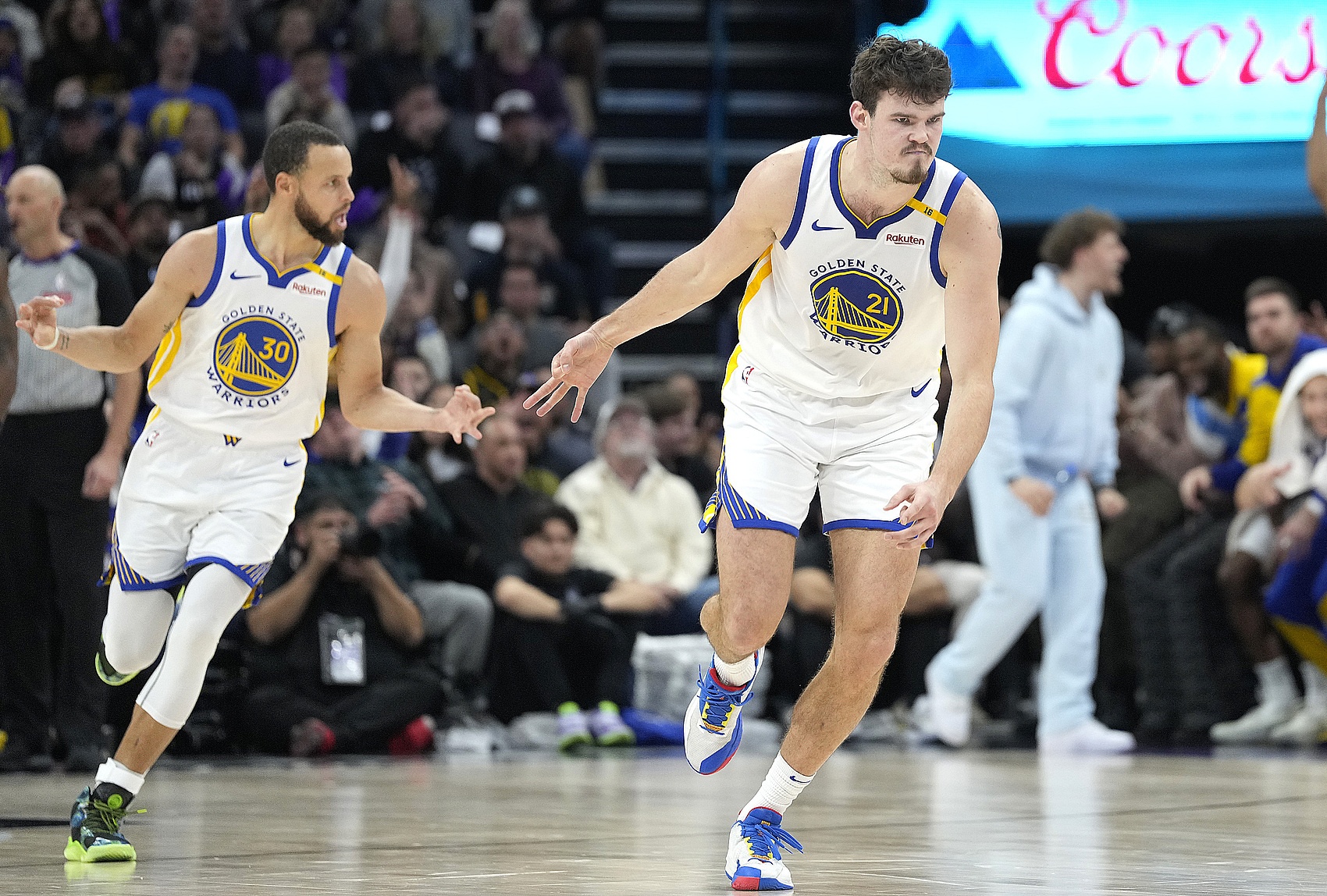 全場(chǎng),庫(kù)里25中16(三分19中12)、罰球12中12,瘋狂砍下56分4板3助2斷!