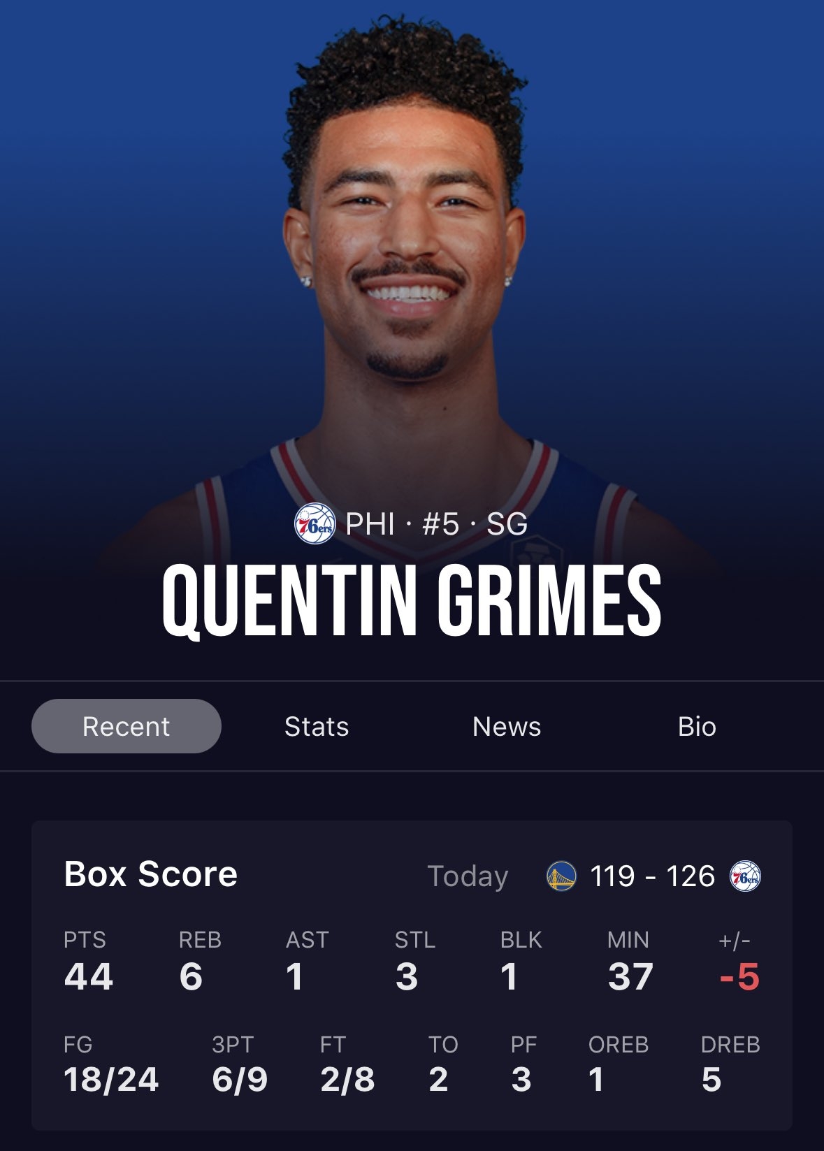 此役,76人后衛(wèi)、獨行俠舊將格萊姆斯表現(xiàn)神勇,他上場36分43秒24投18中,三分9中6、罰球8中2,砍下44分創(chuàng)生涯新高,還有6籃板1助攻3搶斷1封蓋進賬。