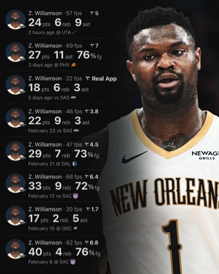 據(jù)統(tǒng)計,在近10場比賽中,錫安在場均28.3分鐘的上場時間里,可以砍下26.3分6.6籃板5.6助攻,投籃命中率高達65.2%,