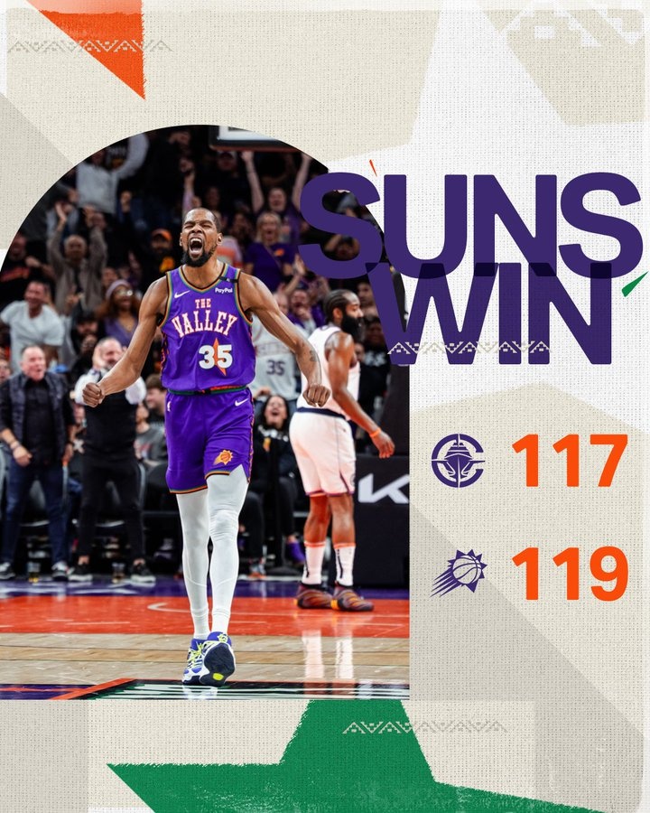 賽后,太陽(yáng)官方曬出贏球海報(bào),為球隊(duì)獲勝立下大功的杜蘭特登上封面,哈登成為背景。