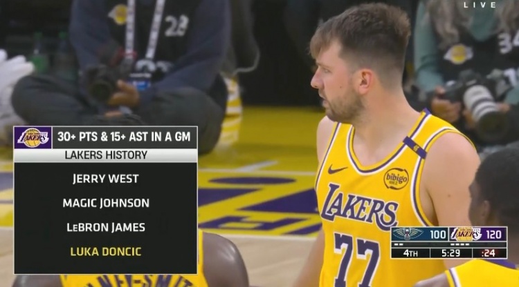 截至發(fā)稿前,湖人球星東契奇已砍下30分15助攻,成為湖人隊(duì)史單場(chǎng)同時(shí)拿到30+得分和15助攻的第4人。前三位分別是杰里-韋斯特、魔術(shù)師約翰遜和勒布朗-詹姆斯。