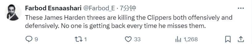 船記Farbod Esnaashari發(fā)推:“哈登這些三分球在攻防兩端都在殺死快船,當(dāng)他打鐵的時(shí)候,每個(gè)人都退不回來?!?/p> 標(biāo)簽: 籃球 NBA 快船 哈登