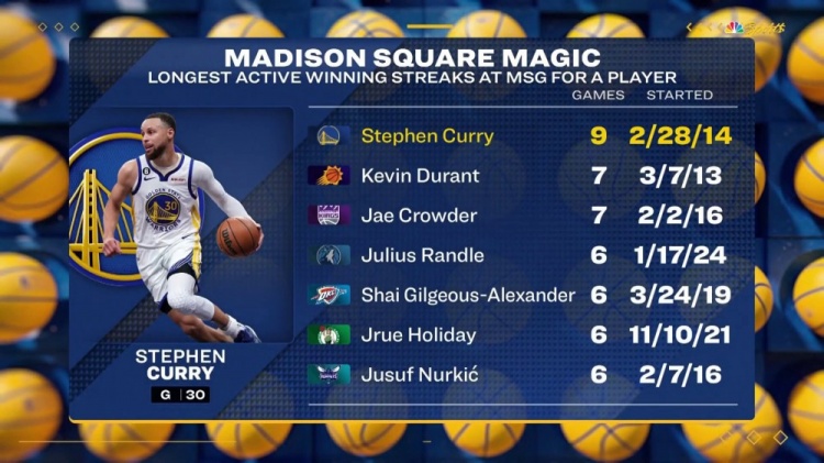 賽前轉(zhuǎn)播方給出數(shù)據(jù),現(xiàn)役球員在麥迪遜廣場(chǎng)花園(尼克斯主場(chǎng),MSG)連續(xù)獲勝場(chǎng)次數(shù)排行榜如下: