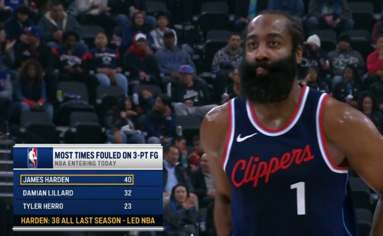 本場(chǎng)比賽之前,快船后衛(wèi)哈登保持著自己在外線的殺傷力,40次三分被犯規(guī)領(lǐng)跑全聯(lián)盟。