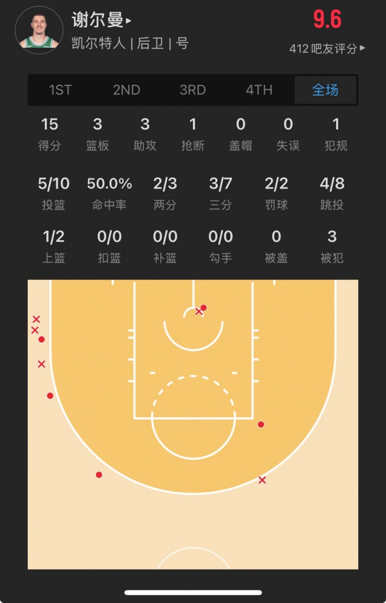 凱爾特人30號(hào)秀 貝勒-謝爾曼 登場29.8分鐘