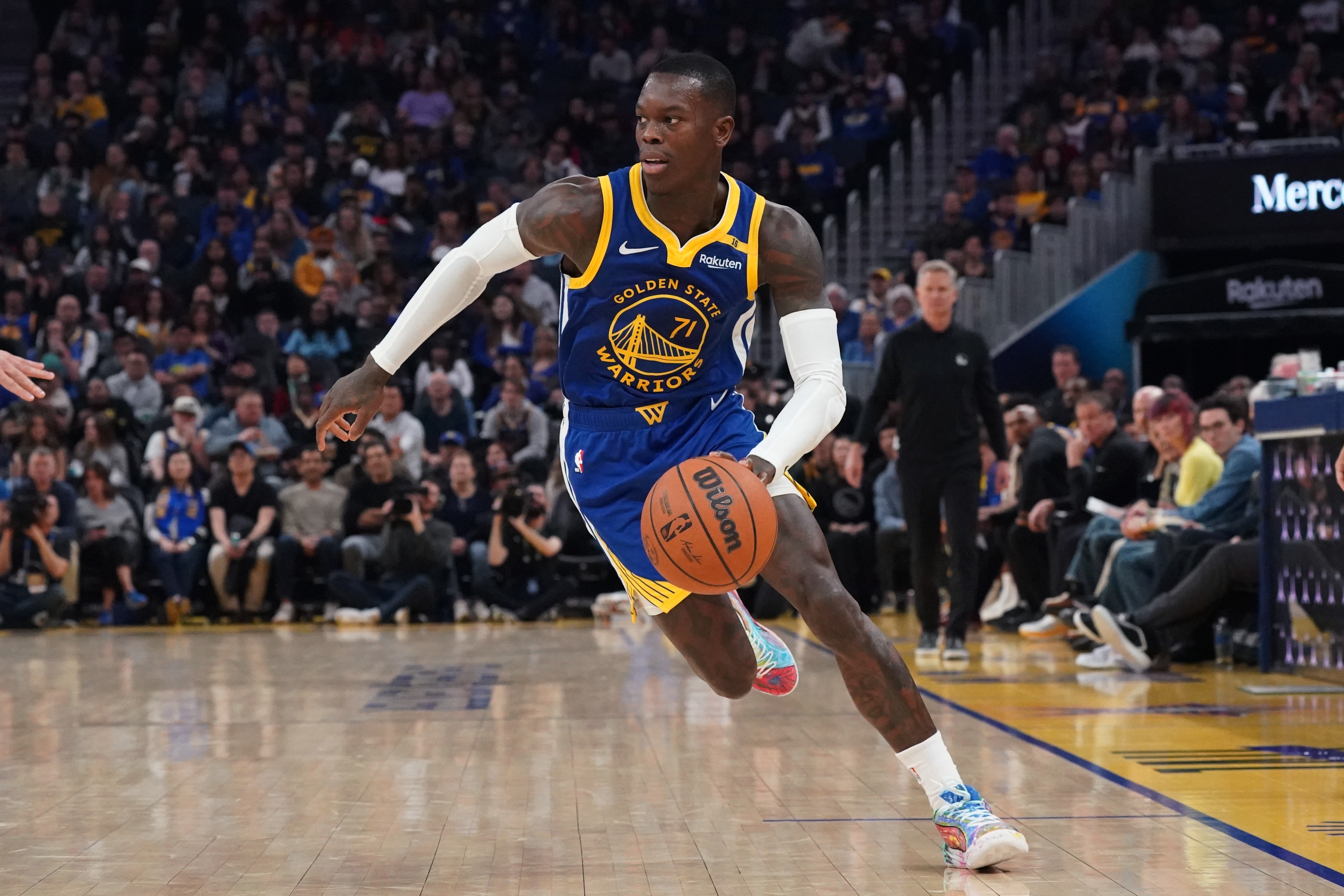 這就是勇士隊在12月中旬交易來丹尼斯-施羅德的初衷:試圖為已經(jīng)淪為聯(lián)盟倒數(shù)三分之一的進(jìn)攻注入新的活力,并在一系列嘗試中做出新的努力,以止住在庫里離場時的失血。但是,盡管勇士隊在交易后堅稱一名高位擋拆組織者將是對球隊的有益補充(在主教練史蒂夫-科爾的帶領(lǐng)下,球隊有時會固執(zhí)地避免過度依賴籃球中最流行的戰(zhàn)術(shù)),但施羅德并沒有融入球隊,他場均可以得到10.6分,三項投籃命中率分別為38%、32%和74%。根據(jù)Cleaning the Glass的數(shù)據(jù),當(dāng)施羅德在場上時,勇士隊在每100個非垃圾時間的進(jìn)攻回合中凈負(fù)9.9分,當(dāng)他在庫里休息時主導(dǎo)進(jìn)攻時,球隊的得分水平仍然處于墊底。