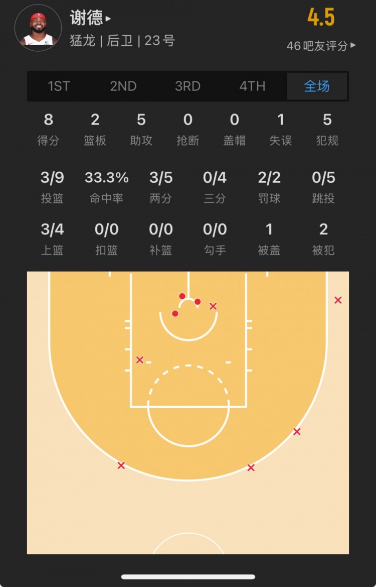 猛龍45號(hào)秀 賈馬爾-謝德 登場(chǎng)26.0分鐘