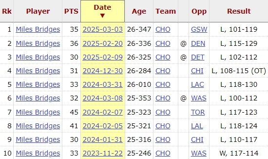值得一提的是,邁爾斯-布里奇斯在過去10場拿到30+的比賽全輸了。