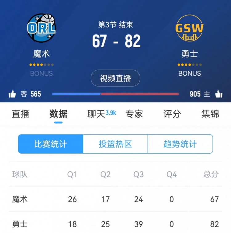 第三節(jié),勇士火力全開,攻防兩端壓制對手,單節(jié)39-24凈勝魔術(shù)15分,而上半場勇士僅得到43分。