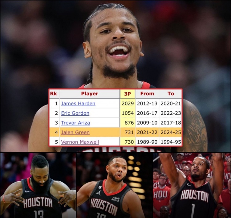 杰倫-格林生涯三分命中數已經超越弗農-麥克斯維爾,火箭隊史第四,僅次于哈登、埃里克-戈登和阿里扎(具體數據如圖所示)。