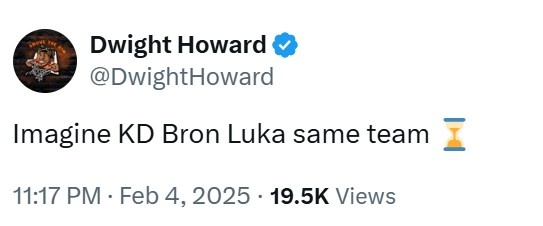 2月4日訊 今天,前NBA球員德懷特-霍華德更推道:“想象一下杜蘭特、勒布朗和東契奇在一支球隊(duì)??。”