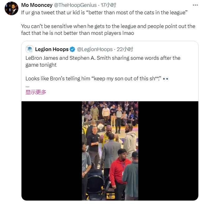 在2023年3月6日,詹姆斯發(fā)推寫道:“天啊,布朗尼絕對強于今天我在聯(lián)盟通(注:NBA官方比賽直播服務)上看到的一些阿貓阿狗。這場面真的有點好笑????????????????”