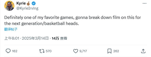 美媒寫(xiě)道:“5年前的今天(2020年1月31日),歐文31分鐘砍下54分,僅投丟了4個(gè)球?!睔W文則回復(fù)道:“這絕對(duì)是我最喜歡的比賽之一,我會(huì)為下一代(球員)/球迷們解析這場(chǎng)比賽。”