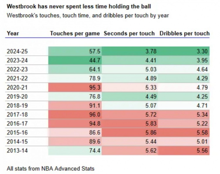 (圖為威少十多年來的持球情況:第一列為賽季,第二列為場均觸球次數(shù),第三列為每次觸球時(shí)間,第四列為每次觸球運(yùn)球次數(shù))