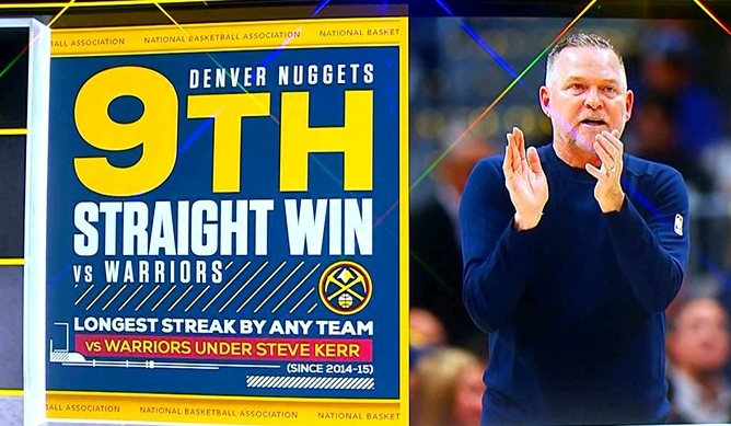 本場(chǎng)過后,勇士面對(duì)掘金已經(jīng)慘遭9連敗。