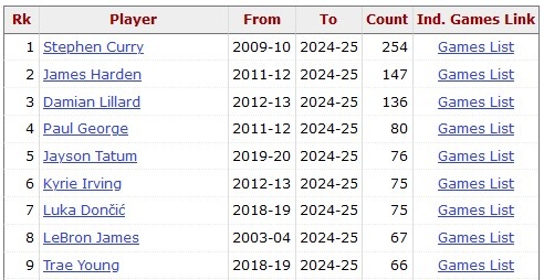 據(jù)統(tǒng)計(jì),這是特雷-楊生涯第67次單場(chǎng)砍下至少30分且投進(jìn)至少5記三分,他也追平詹姆斯排在歷史第8位。