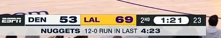 半場掘金失誤14次&湖人10次 利用失誤得分湖人23-16掘金
