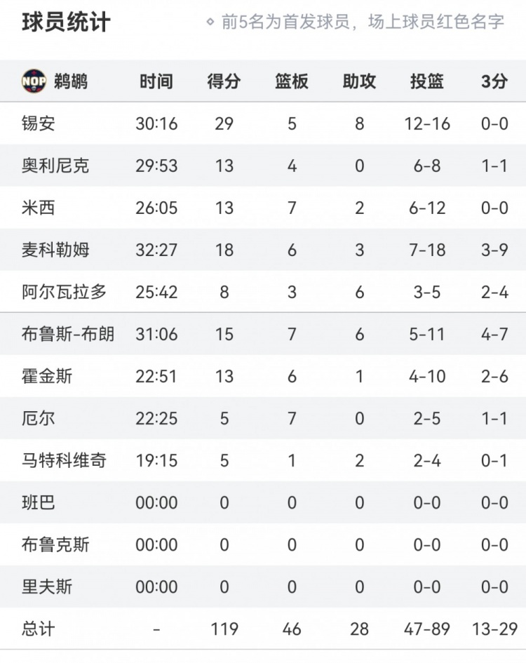 3月20日訊 NBA常規(guī)賽,鵜鶘119-115戰(zhàn)勝森林狼。本場(chǎng)比賽,鵜鶘全隊(duì)多點(diǎn)開花,共6人得分上雙。具體如下: 標(biāo)簽: 籃球 NBA 鵜鶘
