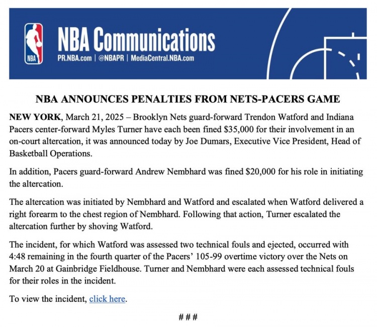 3月22日訊 NBA官方今天公布了籃網(wǎng)步行者沖突的處罰結(jié)果,沃特福德和邁爾斯-特納分別罰款3.5萬(wàn)美元,內(nèi)姆哈德罰款2萬(wàn)美元。