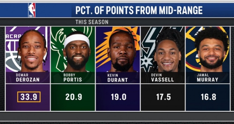 經(jīng)典永不過時!本賽季中距離得分占比德羅贊33.9%第一&杜蘭特第三