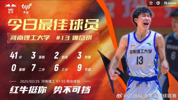在河南理工大學97-93雙加時鏖戰(zhàn)力克西安體院的對決中,得分后衛(wèi)廉岳琪以41分3搶斷的炸裂數(shù)據(jù)化身"人間火器",用33%回合占有率下的62%真實命中率點燃全場。這位身披13號戰(zhàn)袍的得分狂人,在打滿50分鐘的極限消耗下,以10記三分冷箭洞穿對手防線鎖定勝局。盡管中距離9投僅2中,其三分線外10投6中的致命效率卻如手術(shù)刀般精準,更在搏命時刻12次站上罰球線砍下9分。技術(shù)統(tǒng)計表上的5次失誤與41分的極致反差,這位鐵血分衛(wèi)用最暴烈的得分本能證明:在雙加時的煉獄戰(zhàn)場,唯有偏執(zhí)的得分欲望才能劈開勝利之門——他的每一滴汗水都浸透著"寧可打鐵千百次,也要賭一顆子彈射穿黑夜"的鋒芒。