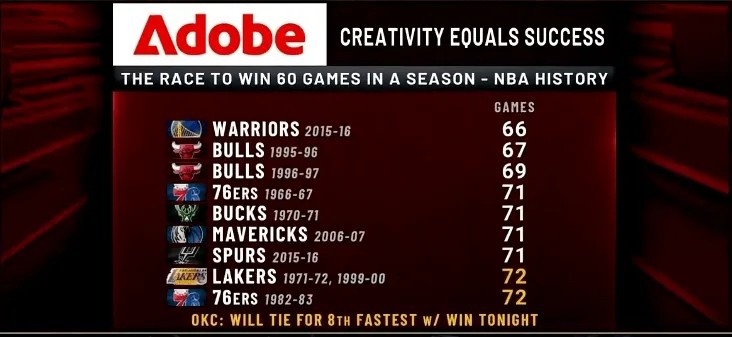 據(jù)統(tǒng)計,雷霆僅用72場比賽就取得60場勝利,追平NBA歷史第八快,詳情如下:
