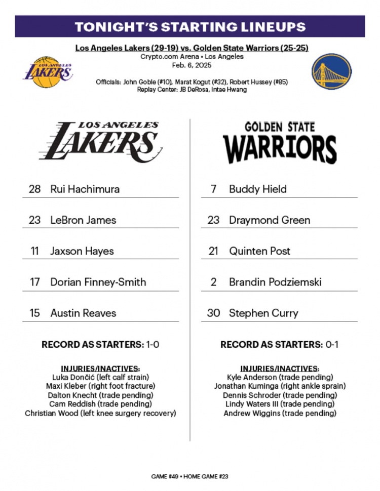 2月7日訊 今天中午11點(diǎn),湖人將主場(chǎng)對(duì)陣勇士。賽前,雙方公布了首發(fā)陣容。