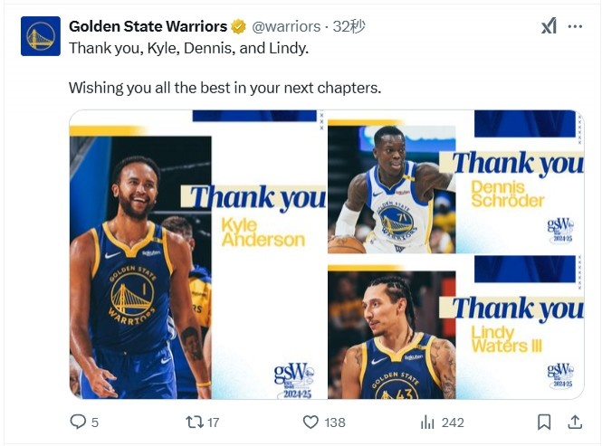 2月7日訊 今天,勇士官推發(fā)圖,對在交易截止前交易走的三位球員表達(dá)了感謝之情。“謝謝你們,李凱爾、施羅德、沃特斯!祝你們在新的旅程中一切順利!”勇士官推如此寫道。 標(biāo)簽: NBA 籃球 勇士