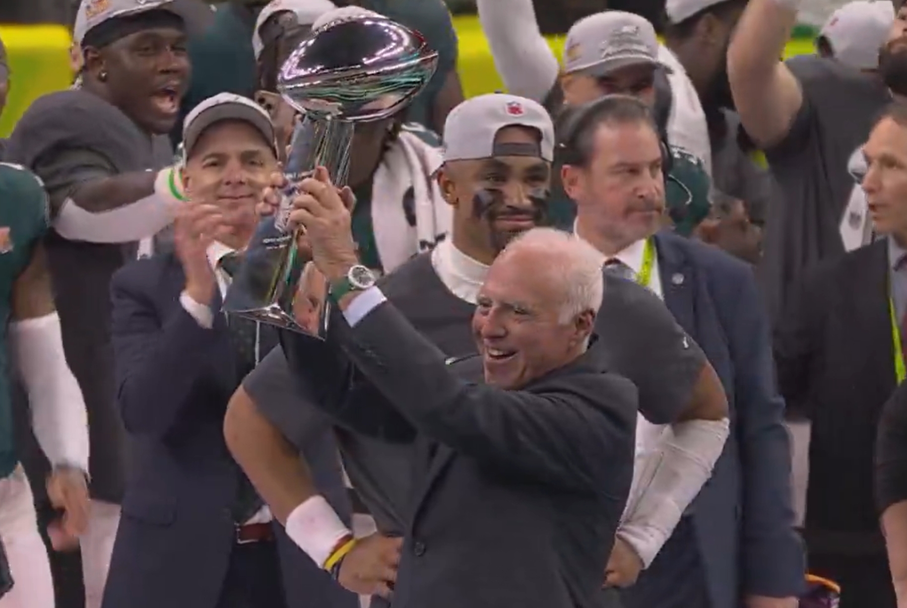 02月10日訊 費城老鷹40-22擊敗堪薩斯酋長,奪得隊史第二個超級碗冠軍。費城老鷹老板杰弗里-盧里現(xiàn)場觀戰(zhàn)并和球員一起慶祝奪冠。