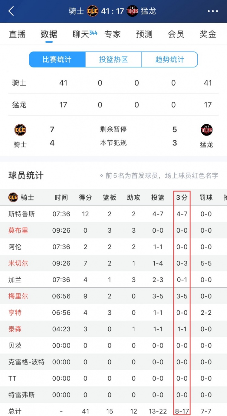 首節(jié)比賽,騎士進(jìn)攻端多點(diǎn)開花,除小莫布里外上場7人皆有得分,合計(jì)扔進(jìn)8記三分,單節(jié)轟下41分直接領(lǐng)先到24分!
