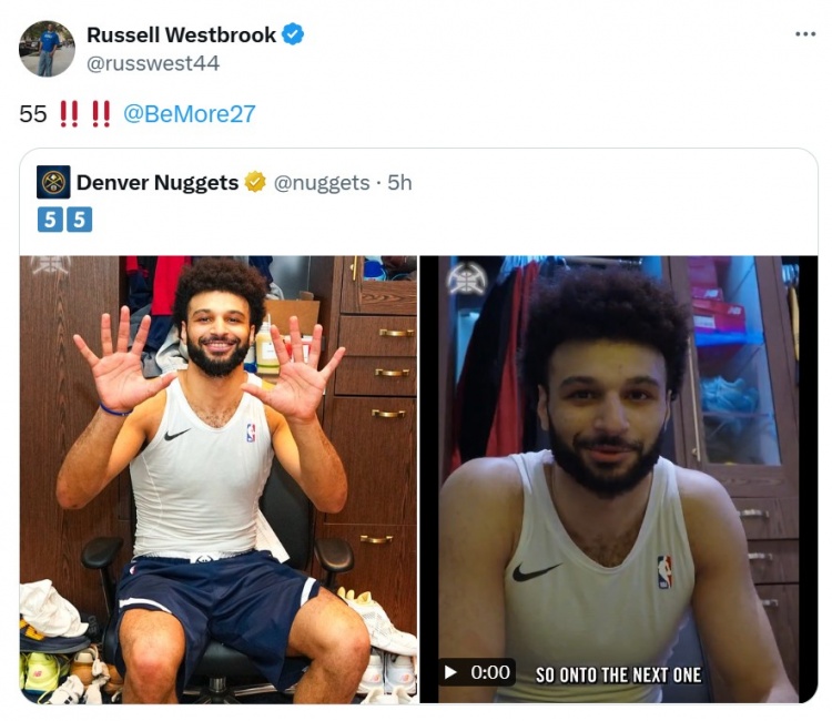 穆雷爆砍55分后用雙手比“55”手勢!威少轉(zhuǎn)發(fā):55????