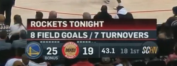 首節(jié)結束,火箭19-28勇士。他們投籃23中8,出現(xiàn)7次失誤。