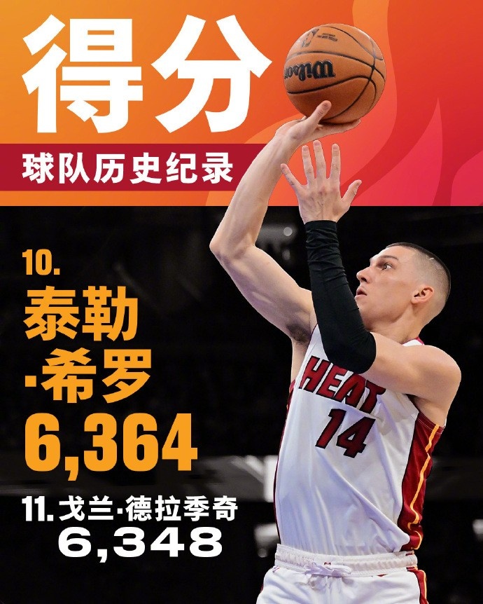至此,希羅生涯總得分來到了6364分,超越了戈蘭-德拉季奇,升至熱火隊(duì)史第十,將追趕哈斯勒姆(6586分)。