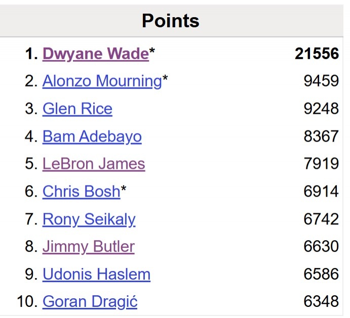 熱火隊(duì)史得分榜前十(賽前數(shù)據(jù))