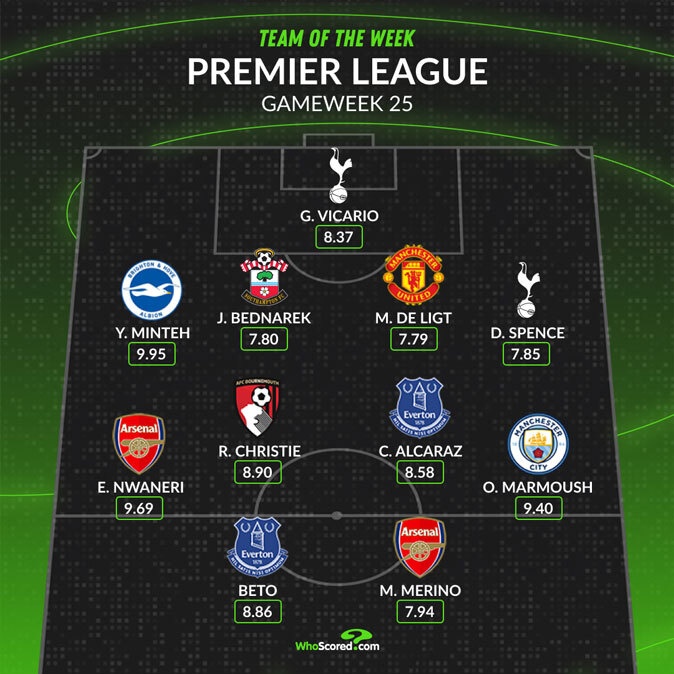 2月17日訊 英超第25輪比賽戰(zhàn)罷,WhoScored排除了本輪最佳陣容,梅里諾、恩瓦內(nèi)里、馬爾穆什、德里赫特在列。